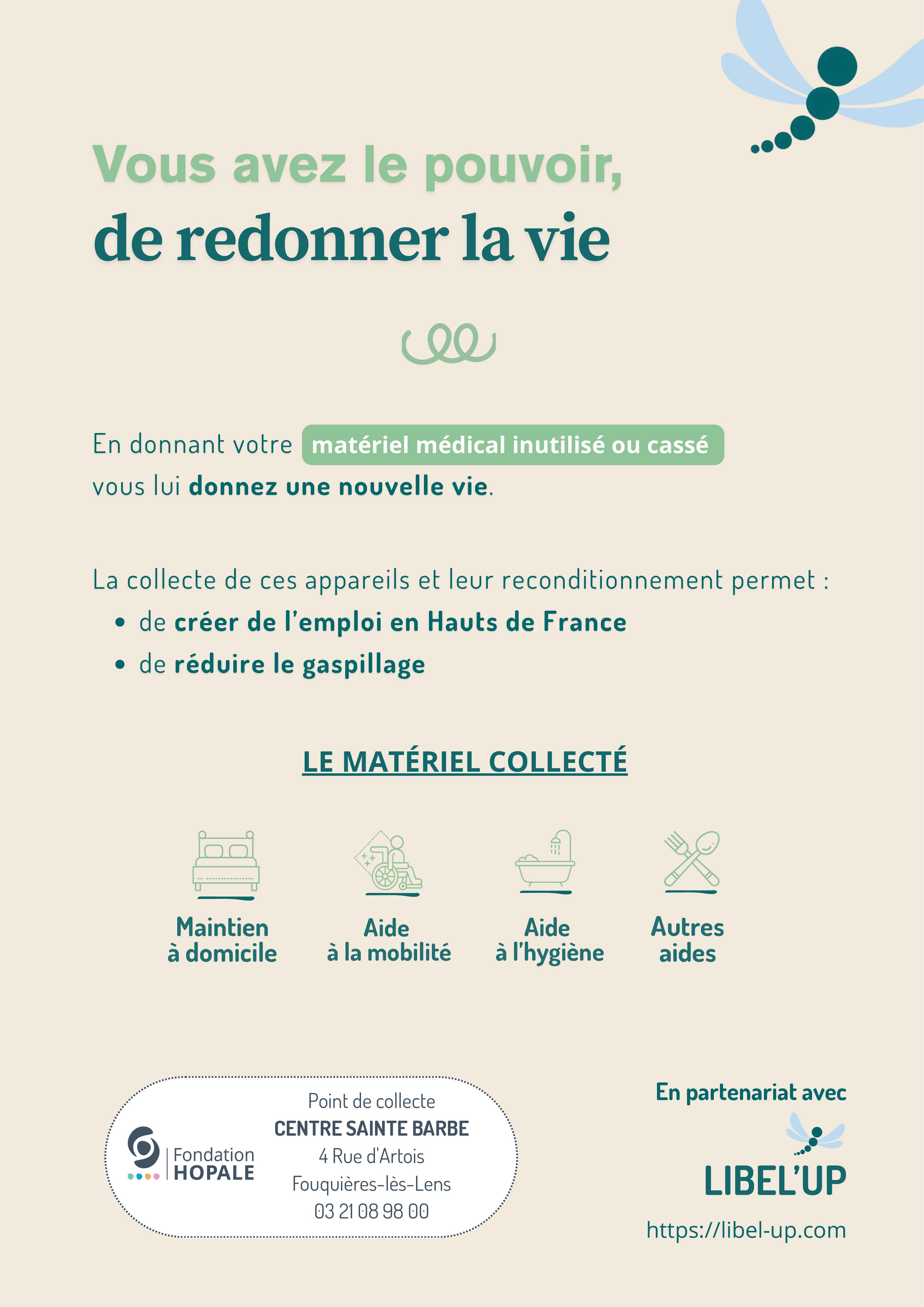 Depuis quelques semaines, un partenariat entre la Fondation Hopale et la société Libel'up a été signé afin d'installer un point de collecte au sein même de notre centre de rééducation Sainte-Barbe, situé à Fouquières-lez-Lens. D'autres structures devraient également accueillir des points de collectes par la suite.